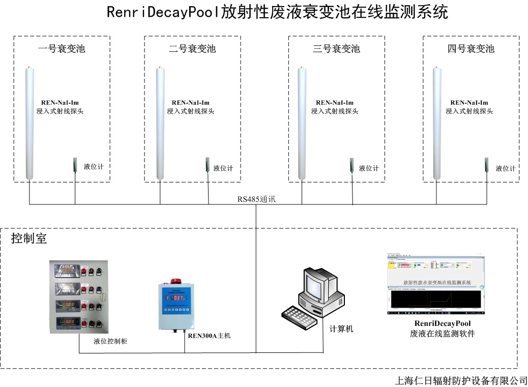 本系統(tǒng)是以工控機或商業(yè)臺式計算機作為上位機,以若干液位測控儀和若干REN300在線輻射安全報警儀及射線探頭為下位機,通過屏蔽電纜線組成一個RS-485通訊網(wǎng)絡。在線監(jiān)測系統(tǒng)軟件是整套系統(tǒng)的大腦,由其完成全部系統(tǒng)的自動化控制過程。
